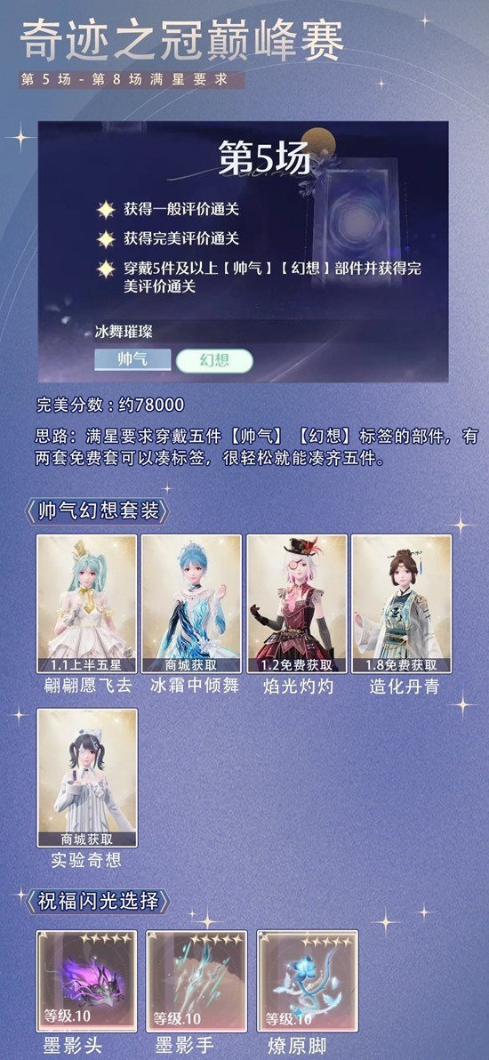 >第5场符合【帅气】【幻想】标签的套装有很多,没有【翩翩愿飞去】和【冰雪中倾舞】的可以用免费套【造化丹青】和【焰光灼灼】还有三星套装【实验奇思】凑标签过关。
